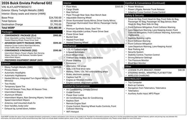 Ebony Twilight Metallic 2026 Buick Envista Preferred FWD 6-Speed Automatic ECOTEC 1.2L Turbo This 2026 Buick Envista comes equipped with, Brake assist, Exterior Parking Camera Rear, Premium 6-Speaker Audio System Feature, Rear Parking Sensors, Wheels: 17 Bright Silver Painted Aluminum, Wireless Apple CarPlay/Wireless Android Auto.